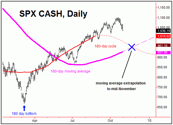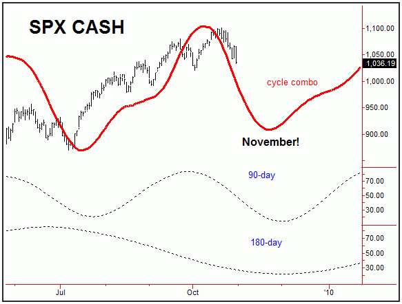 In terms of price, a normal percentage decline with these 90 and 180-day waves will be in the range of 10%-or-better off the top, which would tend to target a move down to the 991 level or lower for the SPX. A key figure as we move into the month of November is the 1019 level, which is the October bottom; taking this out to the downside should signal a push on down to this 10% correction level.